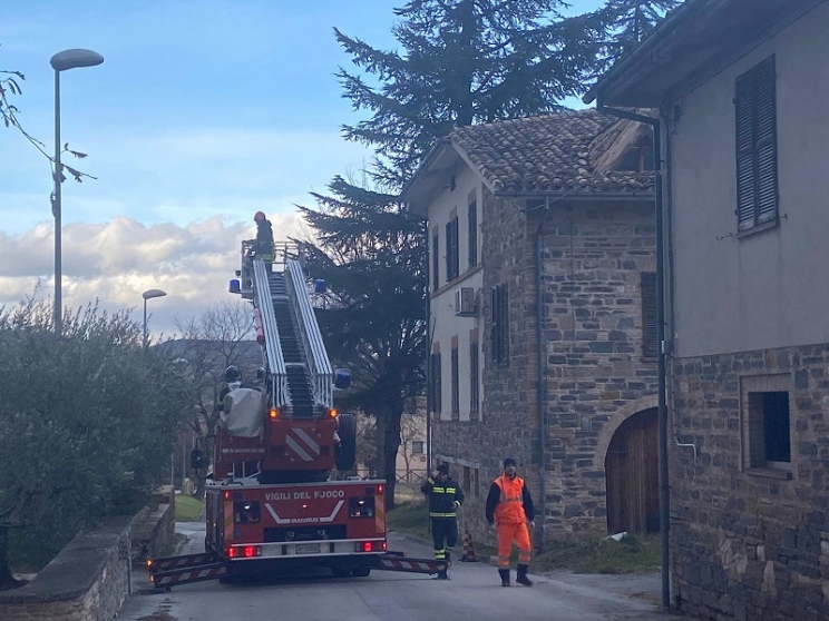 Tegole cadute in strada anche a Caldarola (nella foto in alto) dove anche in questo caso i pompieri hanno provveduto alla messa in sicurezza. Fortunatamente non si segnalano danni a persone.