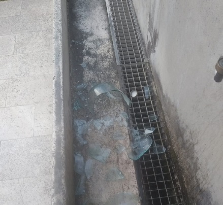Frammenti di vetro vicino ad una fontana in un parco frequentato da bambini