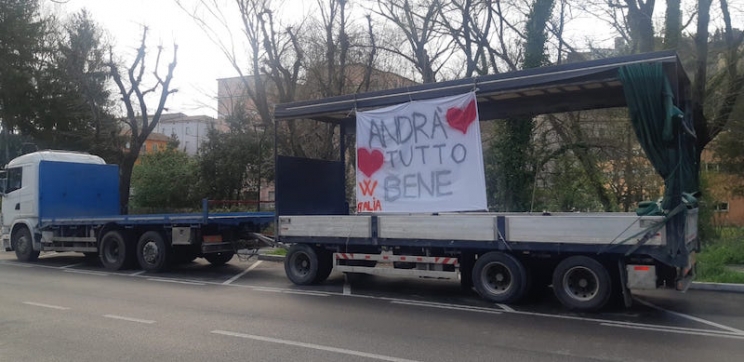È per questo motivo che Simone Rapaccioni, autotrasportatore di San Severino, questo messaggio di speranza lo porta per strada ogni giorno sul suo rimorchio grazie ad uno striscione appeso al mezzo.