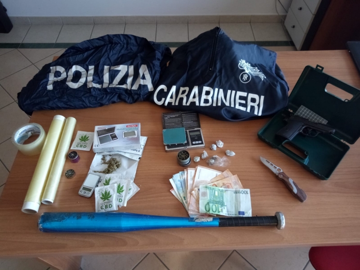 Fermati dalla Polizia di Stato e dai Carabinieri mentre spacciavano droga. Tre le persone denunciate. È successo a Tolentino nella giornata di ieri quando è stata messa in atto una attività congiunta di Polizia e Carabinieri della locale Compagnia. La Polizia ha denunciato a piede libero due ragazzi che stavano spacciando in città e i Carabinieri hanno poi proseguito la stessa attività facendo una perquisizione domiciliare a Pollenza, ove con una rapida attività investigativa è stato individuato un terzo giovane, italiano di circa 24 anni già noto alle forze dell'ordine. Dalla perquisizione a casa di questo, i Carabinieri unitamente al personale della Questura, hanno trovato un'altra piccola quantità di marijuana ed una pistola scacciacani modificata poiché privata del tappo rosso. La pistola già era stata caricata con un proiettile a salve all'interno della camera di cartuccia. Quindi, al termine dell'operazione i denunciati sono stati tre: due per detenzione ai fini di spaccio ed una per porto abusivo d'arma, aggravato dalla modifica applicato sull'arma stessa. Tutto il materiale è stato posto sotto sequestro.