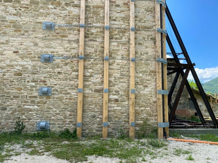 Ho visto che la messa in sicurezza della chiesa di Valfornace, che comprendeva, oltre a delle travi in legno, alcune tirantature in acciaio, era stata modificata.