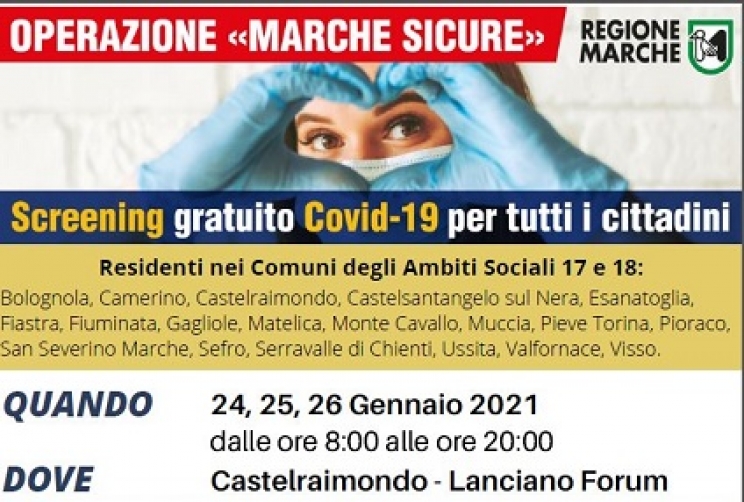 Lo screening di massa interesserà ben 19 Comuni del Maceratese: Bolognola, Camerino, Castelraimondo, Castelsantangelo sul Nera, Esanatoglia, Fiastra, Fiuminata, Gagliole, Matelica, Monte Cavallo, Muccia, Pieve Torina, Pioraco, San Severino Marche, Sefro, Serravalle di Chienti, Ussita, Valfornace e Visso.