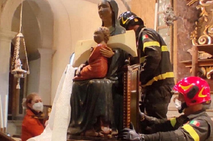 Le operazioni di spostamento in sicurezza dall’edifico danneggiato e il trasporto nella nuova sede sono state possibili grazie all’intervento dei vigili del fuoco del distaccamento di Tolentino e con l’assistenza di una restauratrice incaricata dalla Sovrintendenza Regionale.