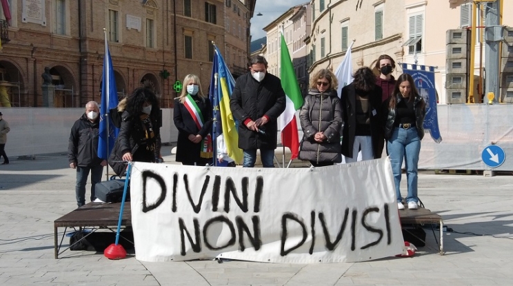 La fine della manifestazione sulle note di “Guerriero” di Marco Mengoni. Il testo della canzone è stato accompagnato da un messaggio rivolto dalla piazza dei San Severino Marche ai ragazzi ucraini in fuga dalla guerra: “Siamo tutti dalla vostra parte”.