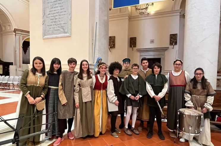 Un omaggio caratterizzato dall’entusiasmo e dalla particolare disinvoltura con cui, indossando abiti dell’epoca,,sia i più piccoli che i più grandicelli, si sono perfettamente calati nei diversi ruoli. Molto apprezzata l’esibizione solista di Gabriella Lucarini che, accompagnata da flauti, violoncello e percussioni, si è cimentata nel suggestivo brano di Angelo Branduardi “Ballo in fa diesis minore” .
