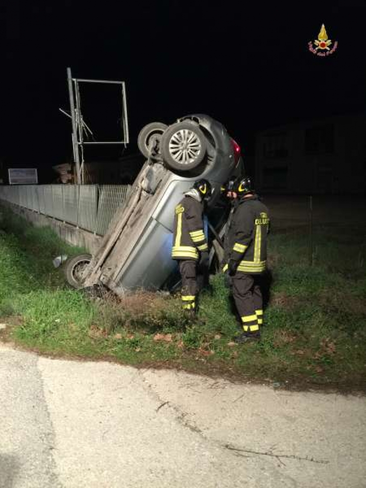 Incidente stradale nel cuore della notte lungo la strada statale Regina nel territorio di Potenza Picena. Un'auto, un'Opel Corsa, per cause in corso di accertamento si è ribaltata finendo fuori dalla sede stradale, con il conducente che è rimasto incastrato fra le lamiere dell'abitacolo.