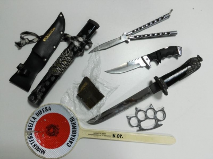 I militari lo hanno fermato mentre girava in città con la sua Alfa e subito il giovane non è riuscito a nascondere un certo nervosismo. Hanno approfondito il controllo ed hanno fatto scattare la perquisizione personale e dell’auto. Sono spuntati fuori alcuni frammenti di spinello ed una noccoliere tirapugni, il cui porto è proibito. D’obbligo, quindi, l’estensione della perquisizione anche all’abitazione del sudamericano. All’interno di questa i carabinieri trovavano la conferma ai loro sospetti: in camera il giovane aveva un panetto di hashish già iniziato di circa 80 grammi, nonché una spada modello “katana”, un coltello serramanico ed un pugnale con manico trasformabile in noccoliere, tutti del genere proibito. Ovviamente il tutto è stato sequestrato e per il sudamericano è scattata la denuncia alla Procura della Repubblica di Macerata per detenzione ai fini di spaccio di sostanze stupefacenti, detenzione e porto illegale di armi e di oggetti atti ad offendere.