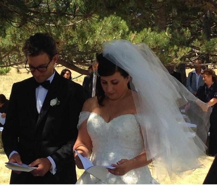 Un bosco nella montagna ferita addobbata a festa con sedie formate da balle di fieno rivestite da un tessuto bianco. La tovaglia dell'altare ricamata a mano dalla zia della sposa, il flauto traverso e una armonica elettronica hanno fatto vivere ai presenti un momento emozionante e unico.
