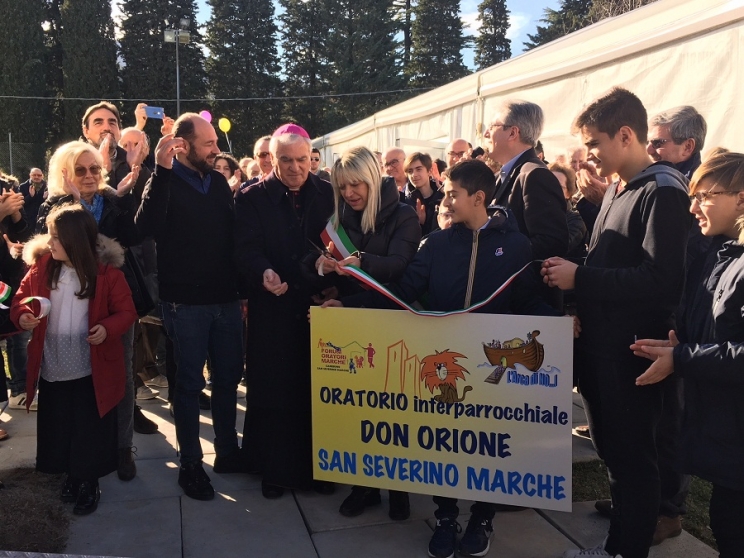 “Oggi è un giorno di grandissima festa. Oggi possiamo ripartire con una nuova storia dell’oratorio”. Con queste parole l’assessore Tarcisio Antognozzi ha salutato la delegazione del Decanato di Cantù Mariano arrivata a San Severino per festeggiare l’inaugurazione del nuovo oratorio provvisorio al termine della messa di questa mattina celebrata dall’arcivescovo Francesco Giovanni Brugnaro.
