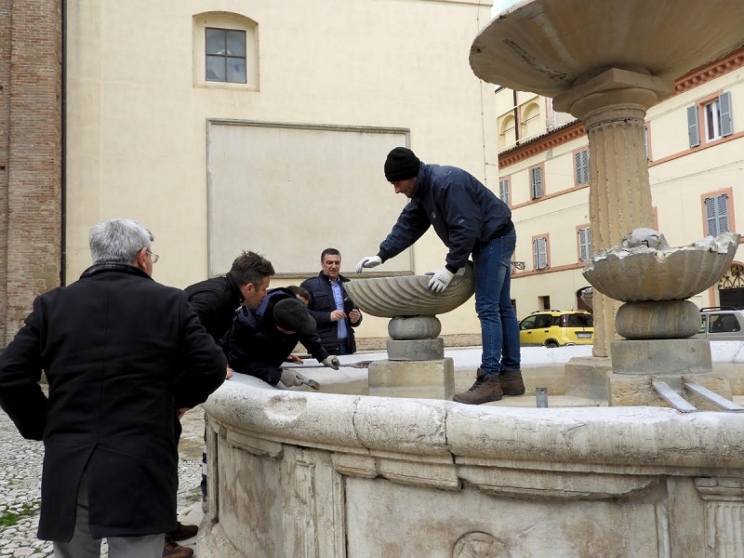 Questa mattina gli scalpellini di Montescaglioso sono giunti a Tolentino, coordinati dal sindaco Vincenzo Zito, per prelevare alcuni pezzi della storica fontana posizionata in piazza Silverj, dietro il complesso monumentale della Basilica di San Nicola, per iniziare un intervento di restauro.