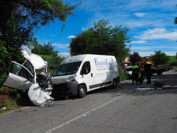 Una Toyota Yaris condotta da una donna I.R. di 44 anni, residente a San Severino Marche, con a bordo il figlio di 12 anni, proveniva da Cantagallo verso Tolentino e si è scontrata con un autocarro che trasportava un piccolo bobcat, condotto da L.S. di Caldarola di 56 anni.