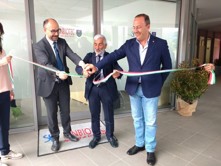 Taglio del nastro per la nuova sede di Synbiotec in Località Torre del Parco. Mattinata di grande festa per l'Università di Camerino. Presenti il rettore prof. Claudio Pettinari, il presidente di Confindustria Macerata Gianluca Pesarini, il sindaco Gianluca Pasqui, il presidente di Synbiotec prof. Alberto Cresci e tutto lo staff dell’azienda insieme al personale docente e non e ai ricercatori dell’università. All’inaugurazione ha preso parte anche l’onorevole Tullio Patassini.
