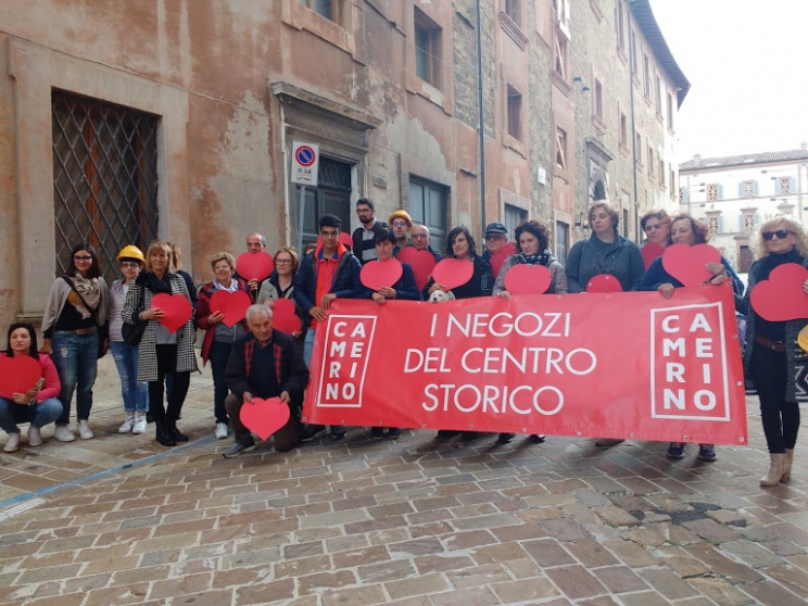 Chiudendo gli occhi si poteva solo immaginare, rivivere nelle loro voci e nei loro ricordi, l’odore del pane e della pizza appena sfornati, l’aroma del caffè della mattina, il profumo di legna bruciare dai caminetti. Due anni sono passati : lo dicono vetrine e scaffali vuoti, banconi e locali che hanno accolto migliaia di persone. Restano lassù dove il tempo si è fermato a quella sera e dove non si poteva che tornare per una carezza infinita. Un cuore su ogni vetrina per esprimere un desiderio condiviso, per far capire che Camerino c’è. Che quel disastro puntellato è un’anima viva e presente nel cuore dei commercianti e di tutti i suoi abitanti. Che la vita è cambiata e si deve andare avanti. Tra poco si riparte per una nuova sfida, ma il cuore resta lassù, insieme alla speranza di potervi tornare.