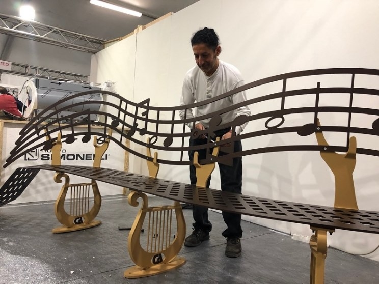 Le due panchine, esposte in anteprima durante TolentinoExpo, sembrano nascere dal terreno, sono sorrette dalla lira, antico strumento tra l’altro dipinto nel soffitto del teatro e nello schienale riportano un pentagramma con le prime note dell’Inno di Mameli. Interamente realizzate a mano sono state ideate da Andrea Cervigni che ha voluto unire più segni distintivi in questa pregevole opera artistica.