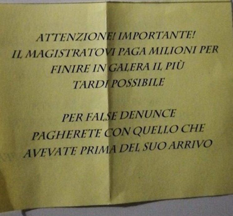 Nel volantino si legge: “Attenzione! Importante! Il magistrato paga milioni per finire in galera il più tardi possibile. Con false denunce pagherete quello che avevate prima del suo arrivo”.