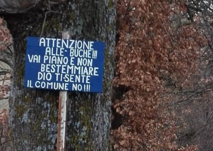 Venerdì, 01 Febbraio 2019 13:33 | Letto 5873 volte   Clicca per ascolare il testo Attenzione, non bestemmiare. Dio ti sente, il comune no La neve e il ghiaccio, di cui linverno non ha privato il Camerino ed il suo territorio, comporta, come noto, disagi non soltanto nel momento dellemergenza, ma anche successivamente quando il manto stradale, soprattutto nelle zone più isolate, risente del sale sparso e degli effetti dello scioglimento. Di conseguenza buche e avvallamenti costringono gli automobilisti a manovre degne di una gara di rally e, immancabili, arrivano segnalazioni e proteste nei confronti delle amministrazioni responsabili della manutenzione delle strade.  Singolare quella degli abitanti di Raggiano, frazione di Camerino, che allinizio della strada che conduce alla chiesa di Palente hanno affisso il cartello in foto (Attenzione alle buche! Vai piano e non bestemmiare. Dio ti sente, il comune no!). Un avviso di sicuro singolare, ma indubbiamente veritiero ed efficace.