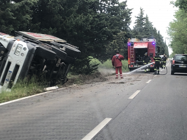Camion carico di terra finisce fuori strada
