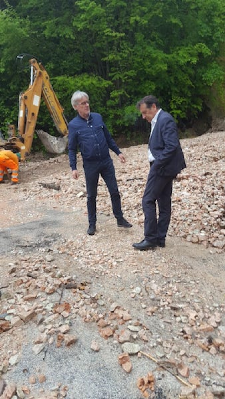 Pietre, melma, tronchi d'albero. Frana a San Liberato dopo lo scroscio d'acqua di oggi pomeriggio che ha interessato la zona. Sul posto è subito intervenuto il sindaco Giuliano Ciabocco con Francesco Paletti, capogruppo e consigliere delegato alla protezione civile. I detriti si sono dapprima fermati nella vasca di contenimento appositamente creata per le frane, ma il materiale era talmente tanto che l'acqua lo ha trascinato anche verso il santuario: "Verso il santuario c'è una vasca di contenimento fatta per evitare che le frane possano coinvolgere la struttura - spiega Paletti - ma il materiale era talmente tanto che ha otturato quella vasca e l'acqua ha trascinato pietre e fango anche verso il santuario. Tutti gli scarichi erano completamente otturati e siamo intervenuti per liberare innanzitutto la strada che è già stata riaperta e i primi scarichi, e ora procederemo a liberare anche la vasca di contenimento perché per questa notte è prevista altra pioggia. L'intervento porterà via parecchio tempo, e si lavorerà anche domani mattina per liberare la zona. Il materiale franato - ha concluso - è veramente tanto e ci ha colto di sorpresa anche se nel giro di 15 minuti siamo intervenuti, giusto il tempo dici".