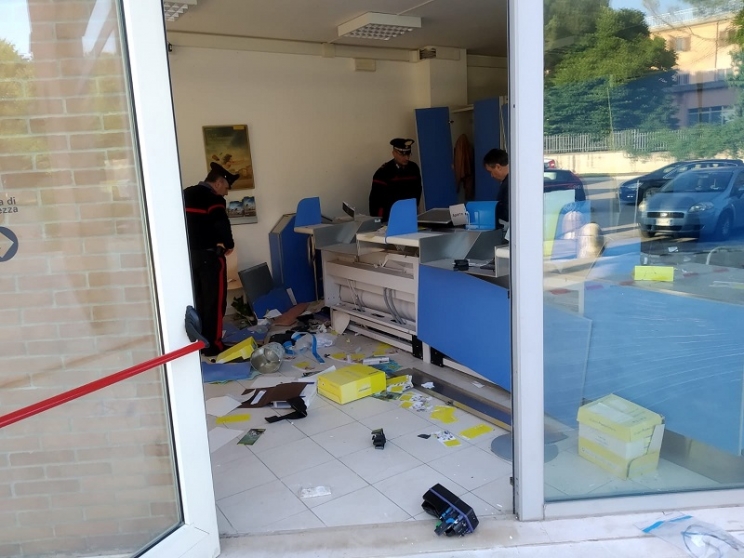 Una forte esplosione a squarciare il silenzio della notte. Assalto all’ufficio postale di Chiesanuova dove ignoti, sembra utilizzando dinamite, hanno fatto esplodere le porte d’ingresso dell’ufficio situato nel palazzo di via Antonio De Mattia dove abitano anche diverse famiglie che sono state svegliate di soprassalto dall’esplosione. Secondo alcune testimonianze il commando sarebbe stato composto da 3 uomini con il volto travisato che sono stati visti fuggire a bordo di una macchina di colore bianco allontanatasi a forte velocità. Ancora in corso di valutazione l’entità del bottino, visto che l’ufficio non dispone di sportello bancomat e che molte pensioni erano state pagate nei giorni scorsi. Sull’episodio indagano i carabinieri di Treia insieme ai loro colleghi di Appignano e ai militari del nucleo operativo e radiomobile di Macerata. Ingenti i danni alla sede andata completamente distrutta.