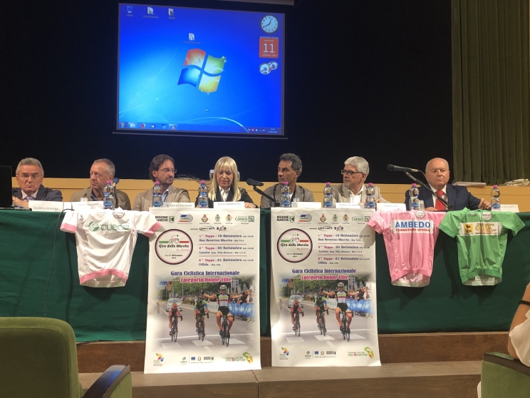 Partenza da San Severino per la seconda edizione del Giro delle Marche in Rosa, la tre giorni (dal 19 al 21) dedicata al ciclismo tutto al femminile che farà tappa anche a Loreto e Offida. Stamattina è stata presentata a San Severino con il sindaco Rosa Piermattei e, fra gli altri, il collega offidano Luigi Massa, l’assessore regionale Moreno Pieroni, uno degli organizzatori dell’evento, Roberto Baldoni e Marco Scarponi, fratello dell’atleta Michele deceduto a seguito di un incidente stradale.