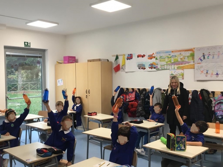 Tante borracce colorate, per la precisione 800, in questi giorni saranno consegnate ai piccoli studenti del comprensivo, l'hanno già ricevuta quelli del plesso Lorenzo D'Alessandro: a portarle, il sindaco Rosa Piermattei, il presidente dell’Assem, Manila Amici, e il dirigente, Sandro Luciani.