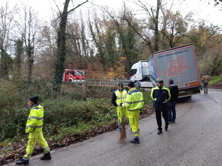 La perdita di aderenza sull'asfalto è stata la causa per cui un mezzo pesante è rimasto bloccato sulla sp 502, in località Colleluce. Il traffico è rimasto bloccato e sono dovuti intervenire i vigili del fuoco insieme alla polizia locale di San Severino. Il camion, di un'impresa di trasporti catanese ma proveniente da Livorno, doveva consegnare 300 quintali di sale per il disgelo stradale ad un'azienda del posto ma, nell'affrontare una salita, la motrice è rimasta incastrata e sopra ad un piccolo ponte e le ruote posteriori sono affondate nel terreno. Inizialmente si attentato di soccorrere l'autotrasportatore con un trattore e ma il tentativo è stato vano. I vigili del fuoco, una volta sul posto, hanno chiesto supporto ad un'autogrù del comando provinciale di Macerata. Benché l'incidente sia avvenuto stamattina intorno alle 10, la viabilità è ancora al momento interrotta.