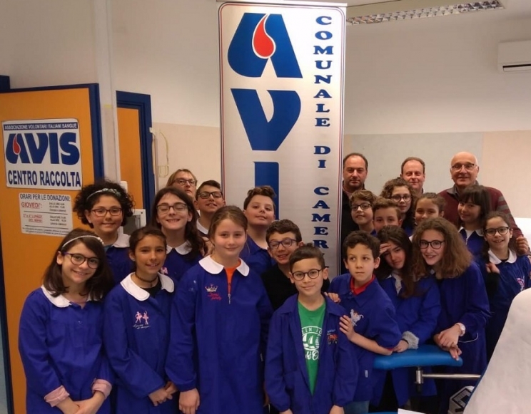 “Noi bambini della classe 5^ della scuola elementare “Salvo d’Acquisto” di Camerino, mercoledì 20 Marzo, accompagnati dalle maestre Carla e Marina, siamo andati nella sede dell’ A.V.I.S comunale di Camerino. Appena arrivati, ci hanno accolto il Presidente Massimiliano Monari, il vicepresidente Sergio Mancinelli e il Dottor Guerrini. Subito ci hanno fatto vedere la sala dove si dona il sangue e il nostro compagno Federico, si è reso disponibile a sedersi sopra una di quelle poltrone per farci vedere come funziona la donazione e ci hanno anche spiegato che in caso di complicazioni, la poltrona si reclina dalla parte della testa. Oltre alla dimostrazione, abbiamo visto anche dei video sulla storia dell’AVIS: - Perché donare! e - Il sistema del sangue e i motivi per cui non si può donare”.