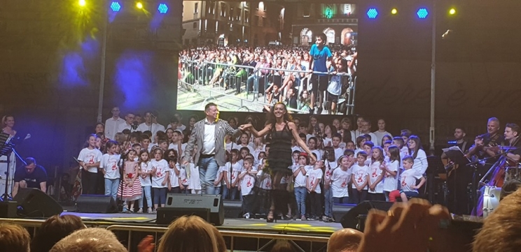 Sul palco, nella prima parte della serata, i video sono stati alternati con le canzoni interpretate dal nuovo coro composto da oltre 100 bambine e bambini provenienti da tutto il maceratese, diretti magistralmente dal Maestro Tiziana Muzi che, in tempi record, ha insegnato loro ben dieci canzoni del repertorio dello Zecchino d’Oro tra cui anche “L’anisello Nunù” interpretato dalla piccola Nicole Marzaroli. Entrambi i cori sono stati accompagnati dal vivo.