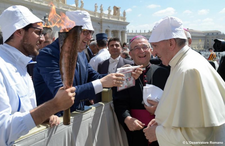 Ieri, al termine dell’udienza generale in Piazza San Pietro Papa Francesco, presente una delegazione del comitato e i vescovi Vecerrica e Marconi, Papa Francesco ha benedetto la fiaccola portata dal giovane tedoforo Alessandro de Pascalis . Il Santo Padre ha poi salutato personalmente il gruppo di venti atleti della Fiaccola e la delegazione di volontari del Pellegrinaggio, presenti a Roma per l'occasione.