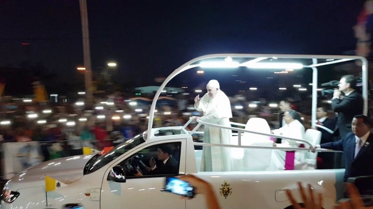 24 gennaio 2019. A Panama il giorno del contatto tra Papa Francesco e i giovani. Sullo sfondo dell'oceano, una miriade di colori in movimento per l'arrivo del Santo Padre in papamobile sulla Cinta Costera.Nella parte più moderna della città la cerimonia di benvenuto al Campo Santa Maria la Antigua. Un appuntamento vissuto con grande entusiasmo dalla numerosa delegazione marchigiana della quale fanno parte anche Fabio, Luca, Pietro e Paolo,  i quattro ragazzi della diocesi di Camerino San Severino Marche.