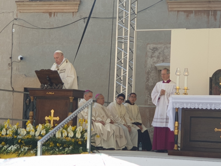 “Di fronte a quello che avete visto e sofferto - ha detto Papa Francesco nella sua omelia - , di fronte a case crollate e a edifici ridotti in macerie, viene questa domanda: che cosa è mai l’uomo? Che cos’è, se quello che innalza può crollare in un attimo? Che cos’è, se la sua speranza può finire in polvere? Che cosa è mai l’uomo? La risposta sembra arrivare dal prosieguo della frase: che cosa è mai l’uomo perché di lui ti ricordi? Di noi, così come siamo, con le nostre fragilità, Dio si ricorda, cioè ritorna col cuore a noi, perché Gli stiamo a cuore.