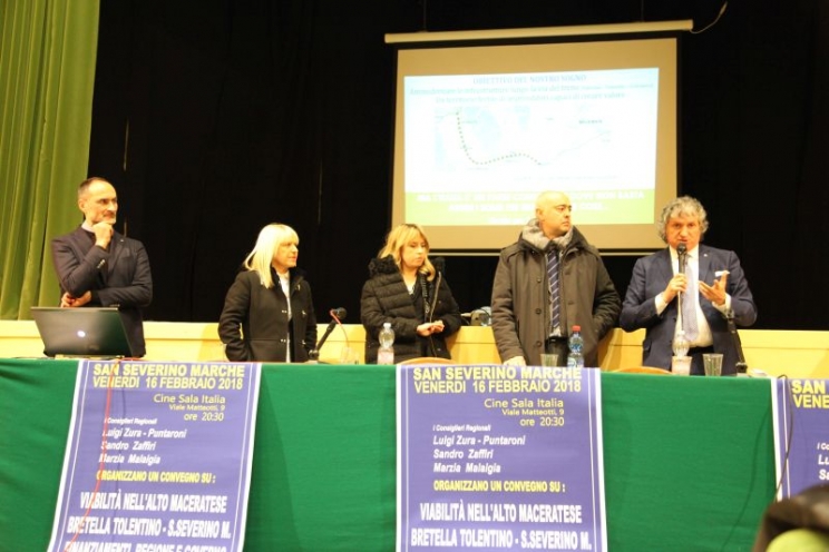 “Con questo traguardo abbiamo messo il primo tassello, gli altri saranno automatici”. Così il consigliere regionale Luigi Zura-Puntaroni ha presentato, al cinema Italia, l’importante novità che riguarda la decennale questione della bretella San Severino-Tolentino. Un’assemblea pubblica a cui hanno preso parte anche i due primi cittadini coinvolti, Rosa Piermattei e Giuseppe Pezzanesi, l’amministrazione comunale di San Severino quasi al completo, due candidati alle politiche (Giuliano Pazzaglini e Giorgia Latini) e tutti i consiglieri regionali di Lega Nord.