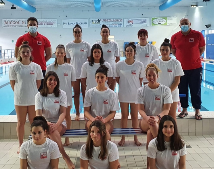Le ragazze del Tolentino scese in vasca: Zingaropoli Marconi, Santandrea (1), Pieroni, Mircoli, Orizi, Kholi (4), El Omari, De Mari (3), Ruani, Eleonori, Crocetti, Pierluigi.